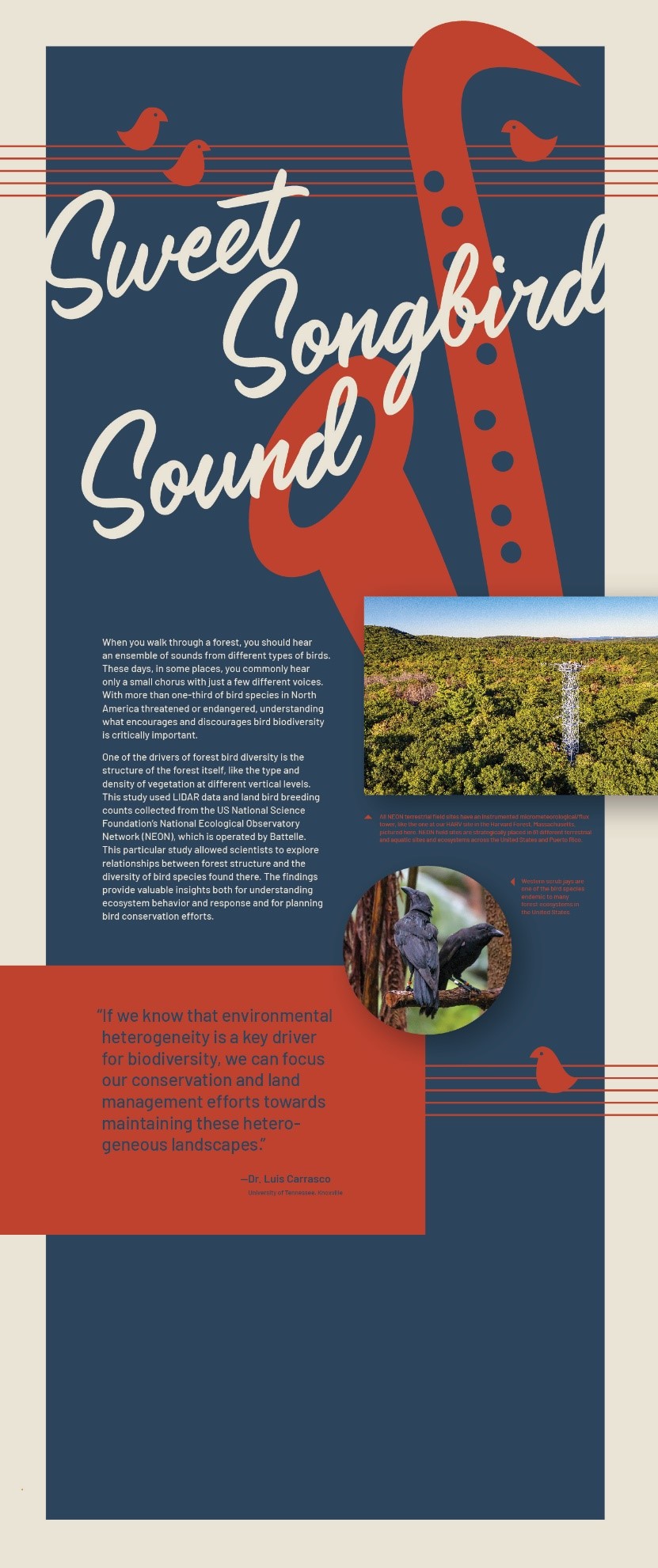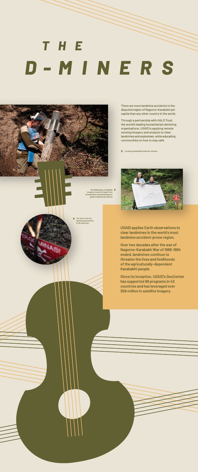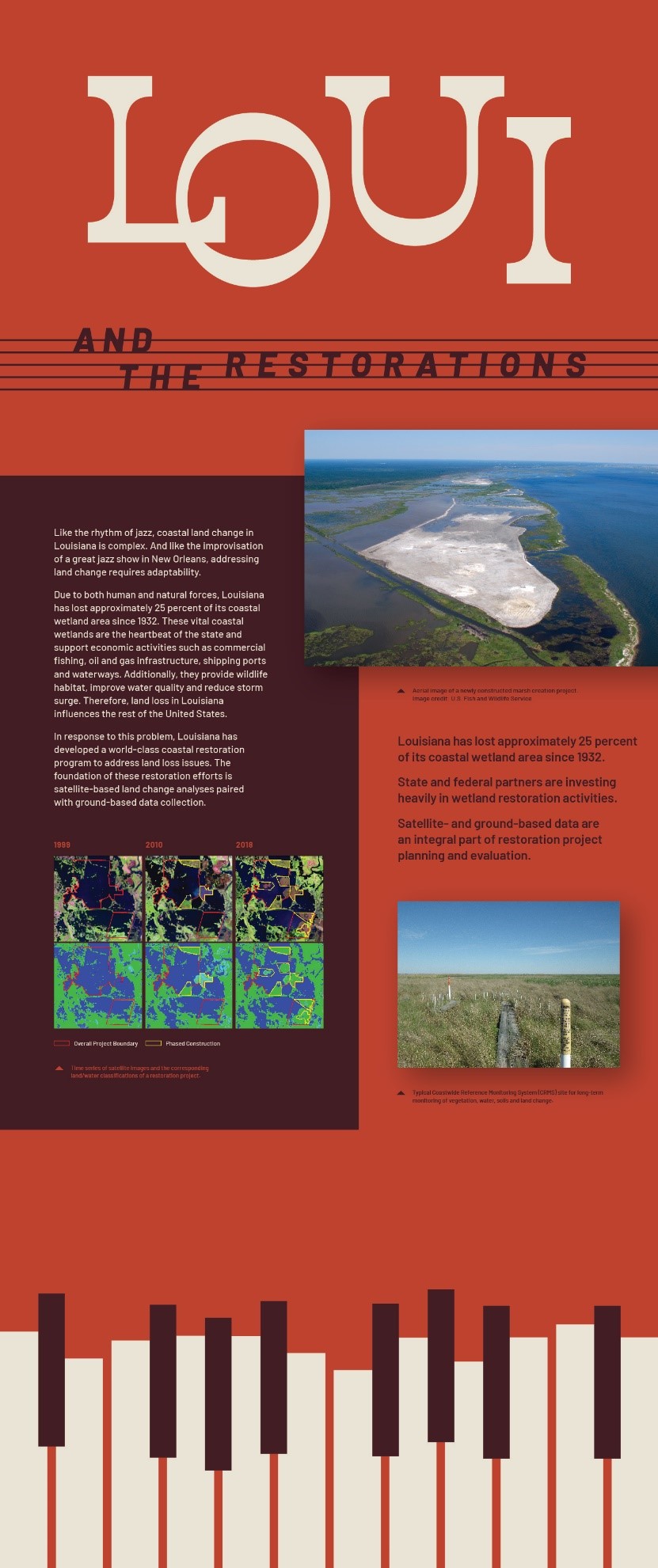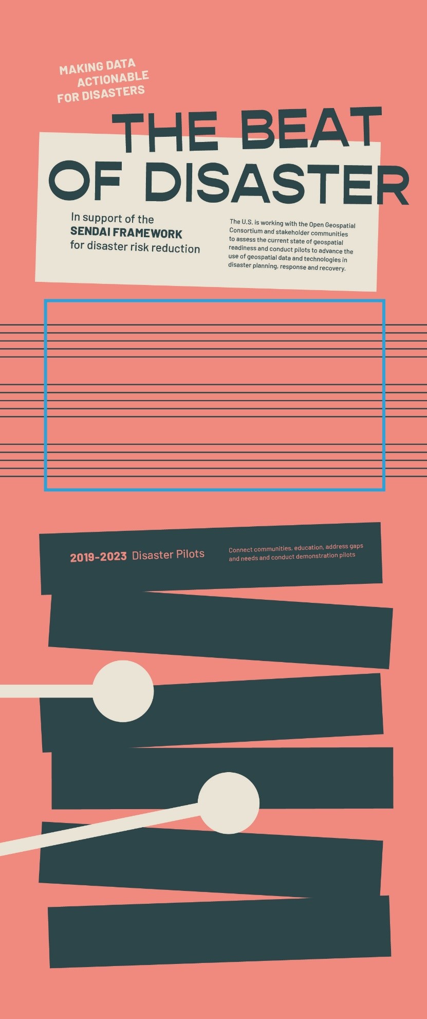 The second interactive area featured our Jazz Stage. Just as each instrument is integral to a song in jazz music, Earth observations ranging from in situ to space-based must be combined with models and other analytical methods to provide information that is actionable for decision-makers. In the Jazz Stage, drums represented in situ Earth observations, a trombone symbolized remotely sensed information, a trumpet signified model outputs, and a piano voiced other data types (e.g. demographics). A screen visualized the data overlays for topics including hurricane forecasting and response, agriculture and food security, and ecosystems and ecosystem services, while speakers played a unique auditory interpretation of the visual overlay.