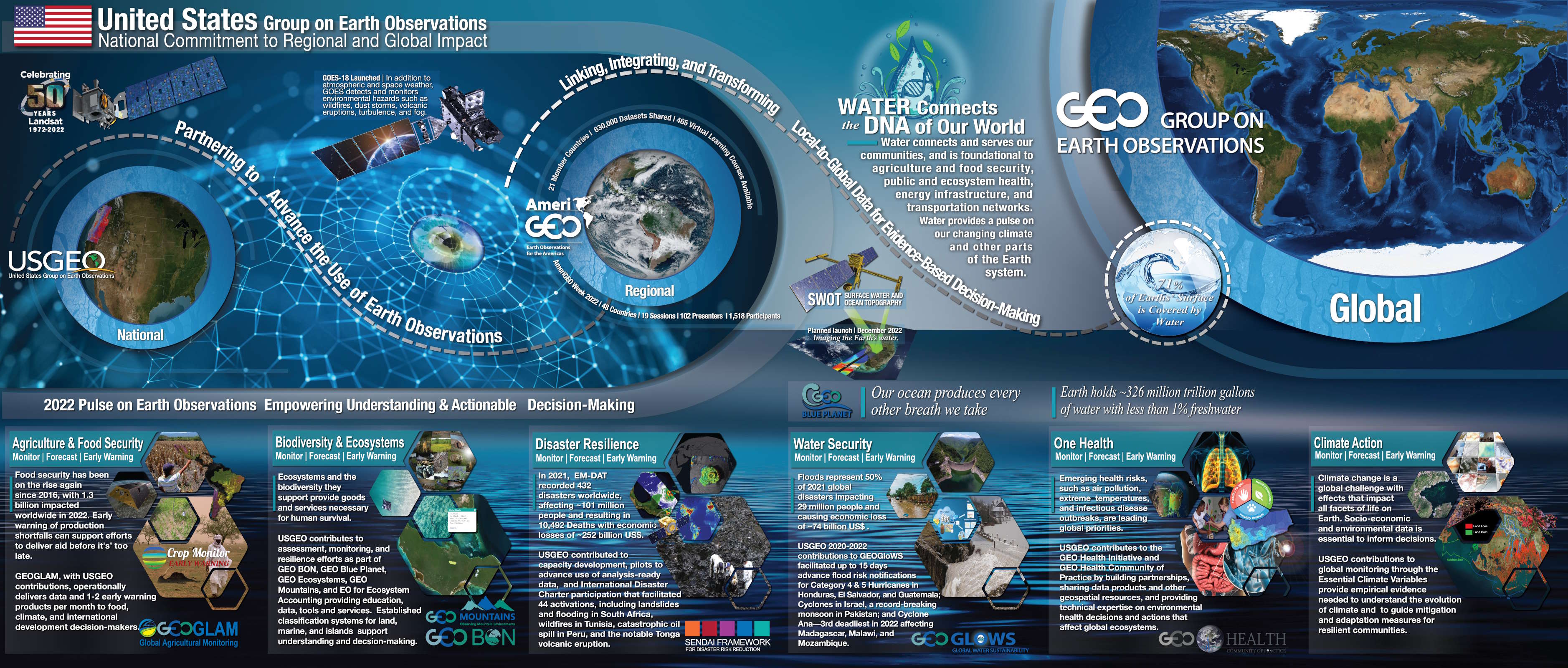 Many individuals, organizations, and communities’ benefit from Earth observations. Using compelling storytelling showcases the impactful uses and enables the uptake of Earth observation and science. With this foundational premise the United States, under the auspice of USGEO, has designed unique settings for the U.S. exhibit booth during the annual GEO Week. While we can’t create the three-dimensional effect of these booths here, our hope is that through the pictures and interactive features you too can enjoy the stories of Earth observations.